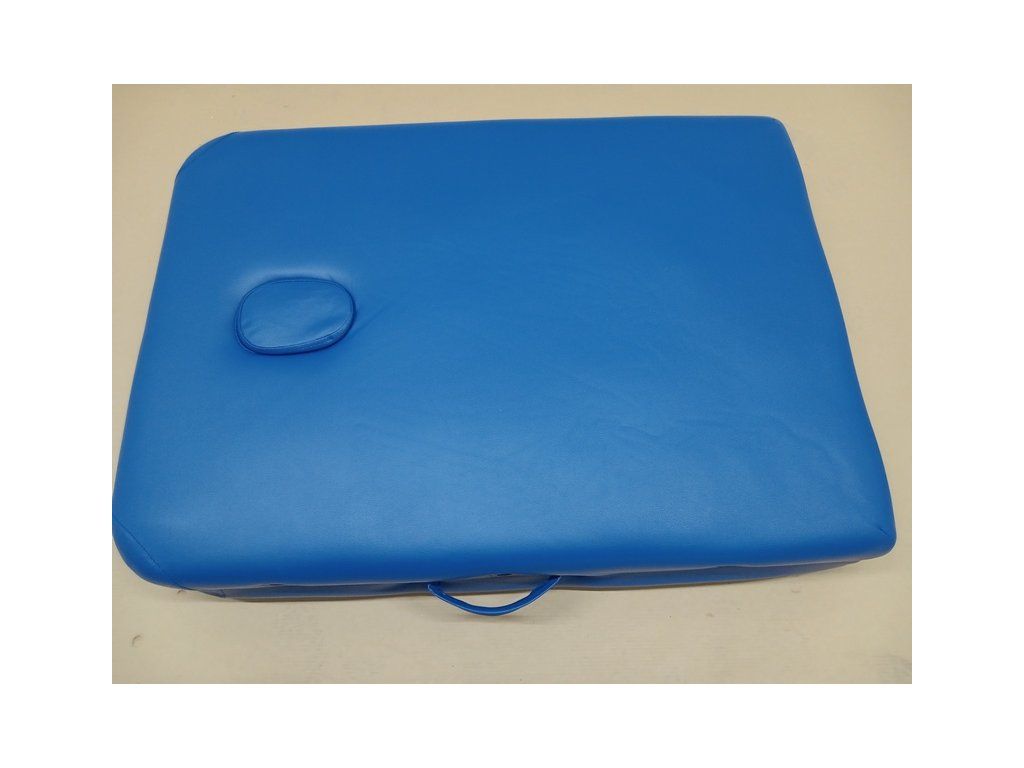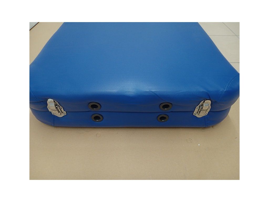 Skladací masážny stôl TANDEM Basic ALU-2 v modrej farbe bol použitý v masérskej škole. Sú na ňom známky používania. Molitan je mierne stlačený a pri otvore na bočnú opierku je mierne posunuté čalúnenie. Poškodenie vidieť v galérii na priložených detailných fotografiách.