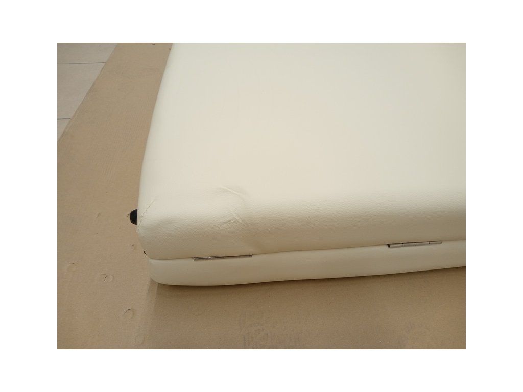 Skladací masážny stôl TANDEM Basic-2 v krémovej farbe má reznú ranu na hrane lehátka a mierne stlačený molitan. Poškodenie vidieť v galérii na priložených detailných fotografiách.