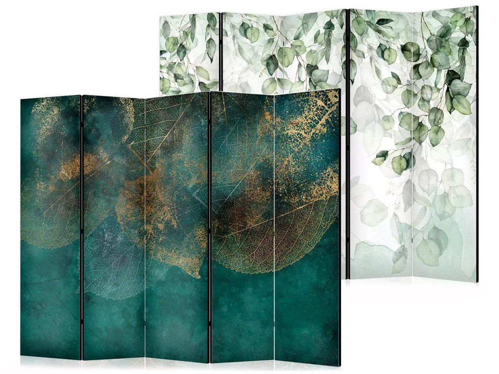 Paraván Fabulo 5-dielny - Zelené listy / Zlaté listy je bez poškodenia - nový a nepoužívaný. Zníženie ceny je z dôvodu nesprávnej kombinácie potlače na jednotlivých stranách.