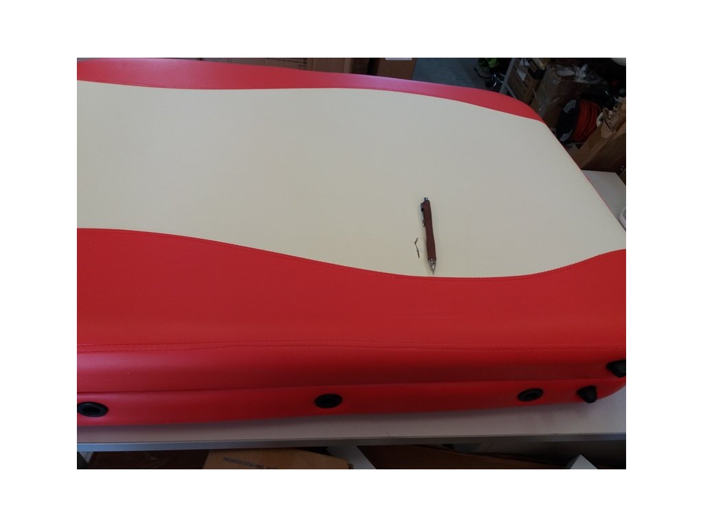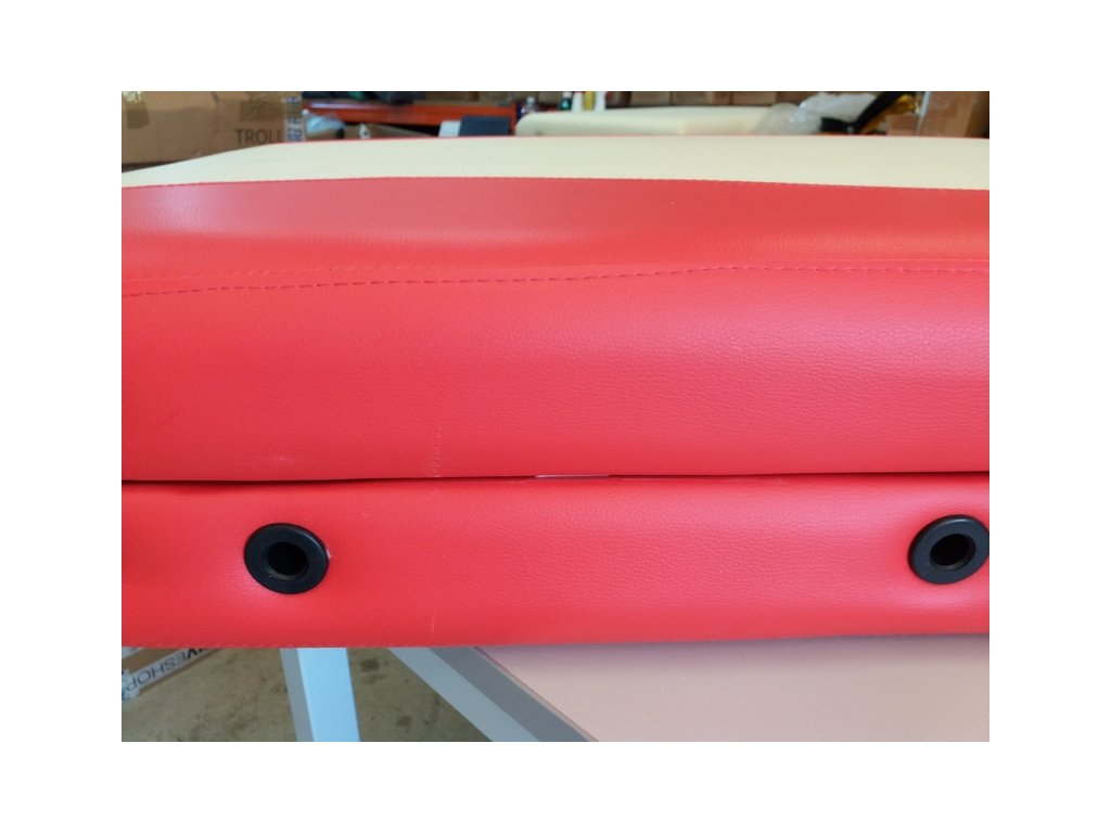 Skladací masážny stôl TANDEM Profi A2D Duo v krémovo-červenej farbe má tržnú ranu na čalúnení a škrabance na hrane lehátka. Poškodenie vidieť v galérii na priložených detailných fotografiách.