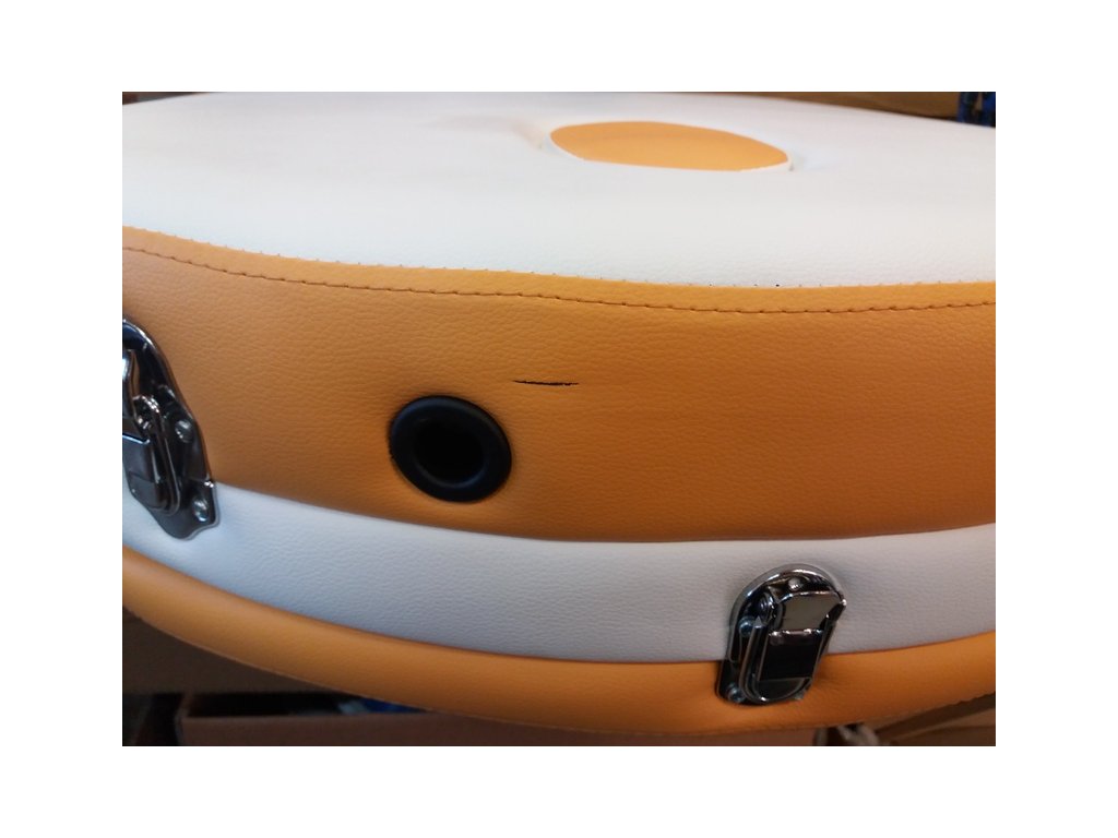 Skladací masážny stôl TANDEM Profi A3D Oval Duo v bielo-broskyňovej farbe má reznú ranu na hrane lehátka a drobné dierky na čalúnení. Poškodenie vidieť v galérii na priložených detailných fotografiách.
