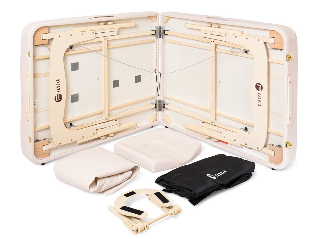 Profesionálne drevené dvojdielne skladacie masážne lehátko Fabulo Ayurveda je určené predovšetkým masérom a pracovníkom v oblasti wellness priemyslu. Napriek tomu, že je masérske lehátko skladacie, vďaka jeho stabilite ho vrelo odporúčame aj ako stabilné vybavenie masérskych salónov. Prenosné masážne lehátko Fabulo Ayurveda je veľmi praktické, systém laniek zabezpečuje jeho rýchle zloženie a rozloženie, preto je vhodné pre masérov, ktorí pravidelne cestujú za zákazníkmi. Masérske lehátko dodávame spolu s príslušenstvom, ktoré sa dá uschovať vo vnútri lehátka. Vysoká kvalita spracovania a doplnky prispievajú k vysokému pohodliu zákazníkov.