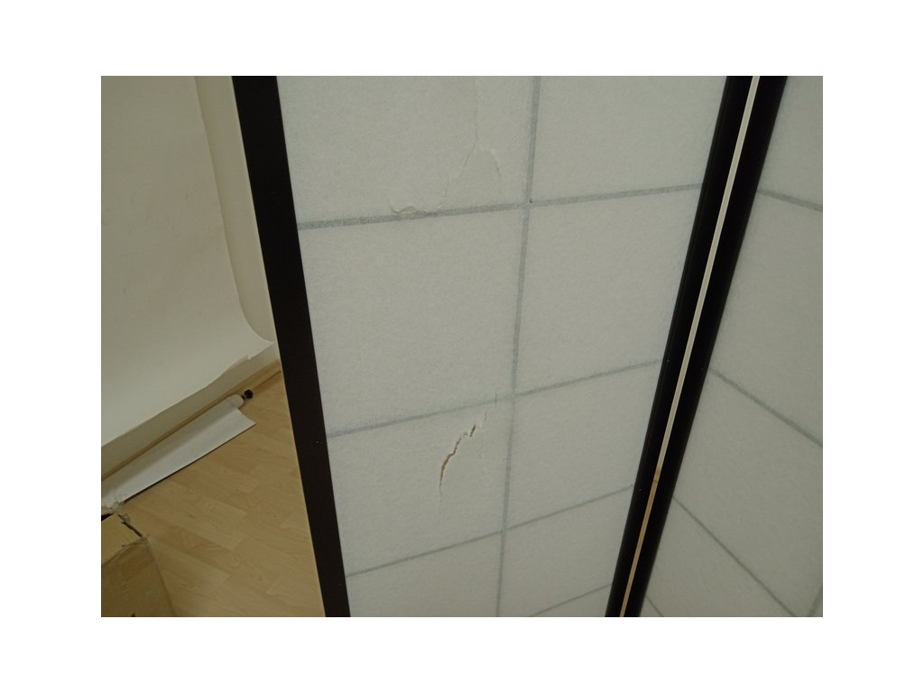 Drevený paraván ACRON 4-dielny v čiernej farbe má poškodenú konštrukciu a výplň. Poškodenie vidieť v galérii na priložených detailných fotografiách.