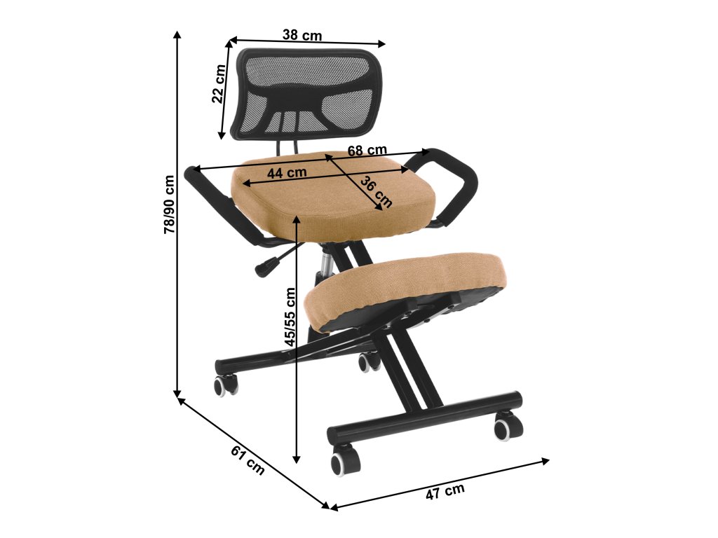 Pevný kovový rám zaisťuje stabilitu a látkové čalúnenie komfort a dokonalé pohodlie aj pri dlhšom sedení. Svojou výškou 90 cm, šírkou 67 cm a hĺbkou 75 cm je kľakačka dostatočne robustná, ale pritom s ňou možno ľahko manipulovať aj vďaka pogumovaným kolieskam. Tie zároveň chránia podlahu pred poškriabaním. Výšku sedadla či opierky rúk si môžete si ľahko nastaviť podľa potreby.