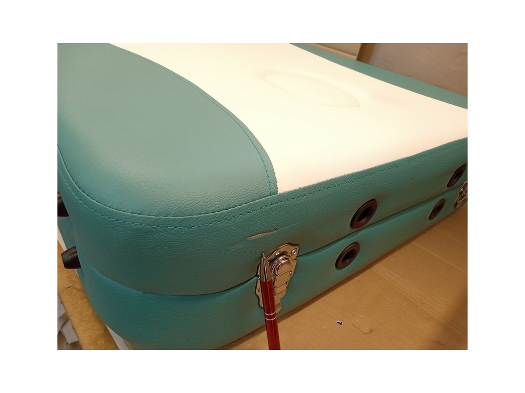 Skladací masážny stôl TANDEM Profi A2D Duo v bielo-tyrkysovej farbe má reznú ranu na čalúnení. Poškodenie vidieť v galérii na priložených detailných fotografiách.