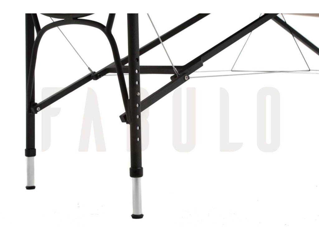 Silnú a robustnú konštrukciu masážneho stola Fabulo TITAN Set zdôrazňuje čierne práškové lakovanie nôh zváraného hliníkového rámu. Je mimoriadne vhodné na intenzívne používanie ako pri športových masážach. Maséri hlavne v športových kluboch, ktoré veľa cestujú a potrebujú mať po ruke kvalitné masérske lehátko ocenia jeho ľahkú konštrukciu (len 11kg). Fabulo Titan Set s oválnym reiki panelom ponúka voľný priestor medzi nohami stola a umožňuje pohodlné sedenie maséra. Pevné protišmykové gumené ochrany nôh zabezpečujú, že masážne lehátko zostáva stabilne na mieste aj na klzkých povrchoch ako plávajúca podlaha alebo dlažba. Masérsky stôl Fabulo Titan je vybavený systémom "press&click", vďaka ktorému sa výška lehátka veľmi jednoducho a pohodlne nastavuje a nie je potrebné pracné skrutkovanie.