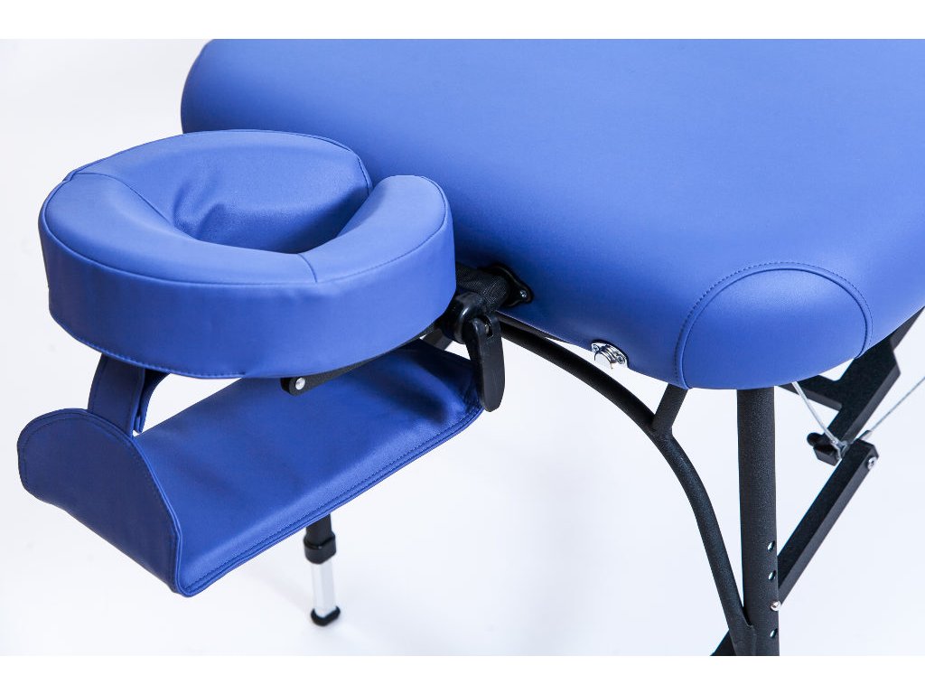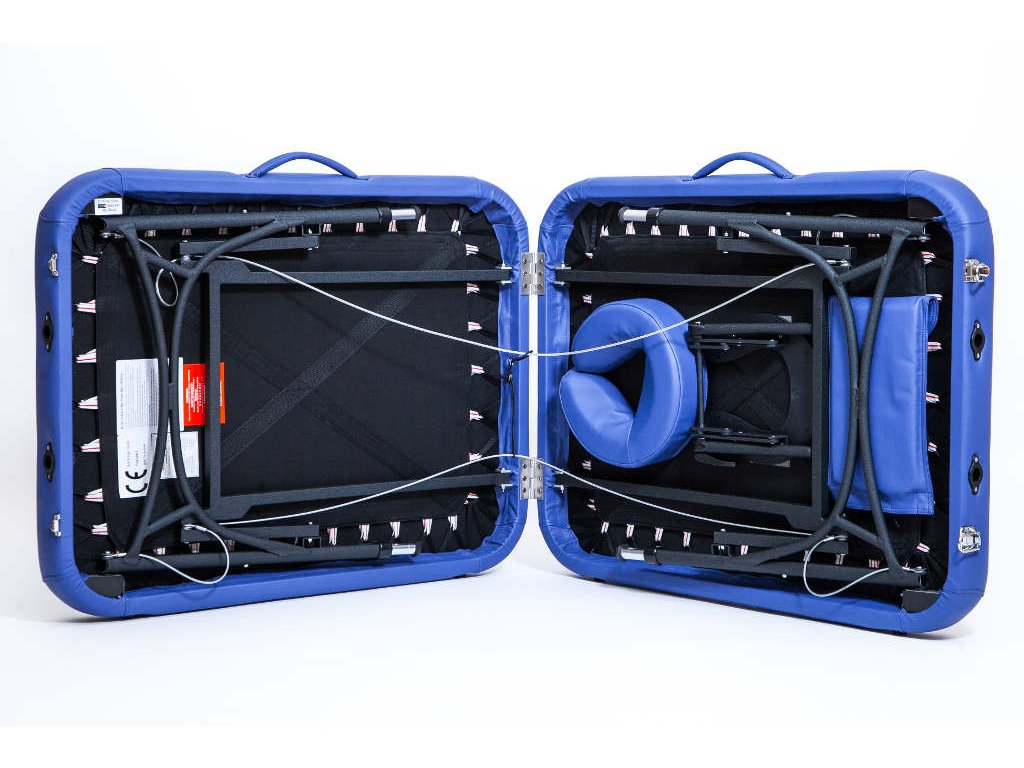 - Polstrovaná prenosná taška s úchytkami a nastaviteľným ramenným popruhom je vybavená s veľkým vreckom pre pohodlné uloženie masérskych pomôcok ako sú valec, prestieradlo alebo masážne oleje. Spevnené dno tašky zabraňuje prederaveniu od nožičiek stola, čo býva častým problémom pri taškách lacných lehátok.