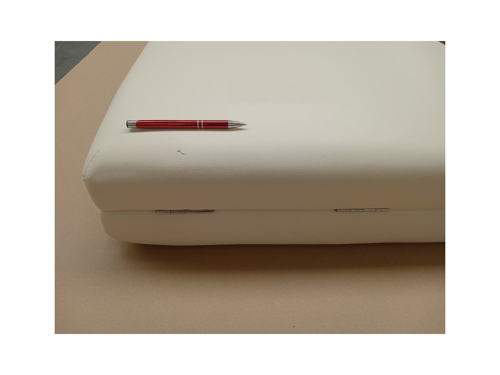Skladací masážny stôl TANDEM Basic ALU-2 v krémovej farbe má reznú ranu na čalúnení. Poškodenie vidieť v galérii na priložených detailných fotografiách.