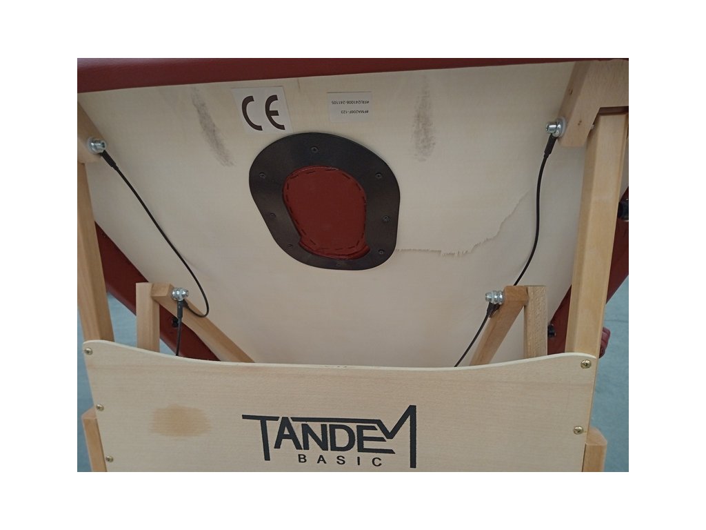 Skladací masážny stôl TANDEM Basic-2 v bordovej farbe má prasknutú preglejku - pre používanie je nutná oprava! Poškodenia vidieť v galérii na priložených detailných fotografiách.