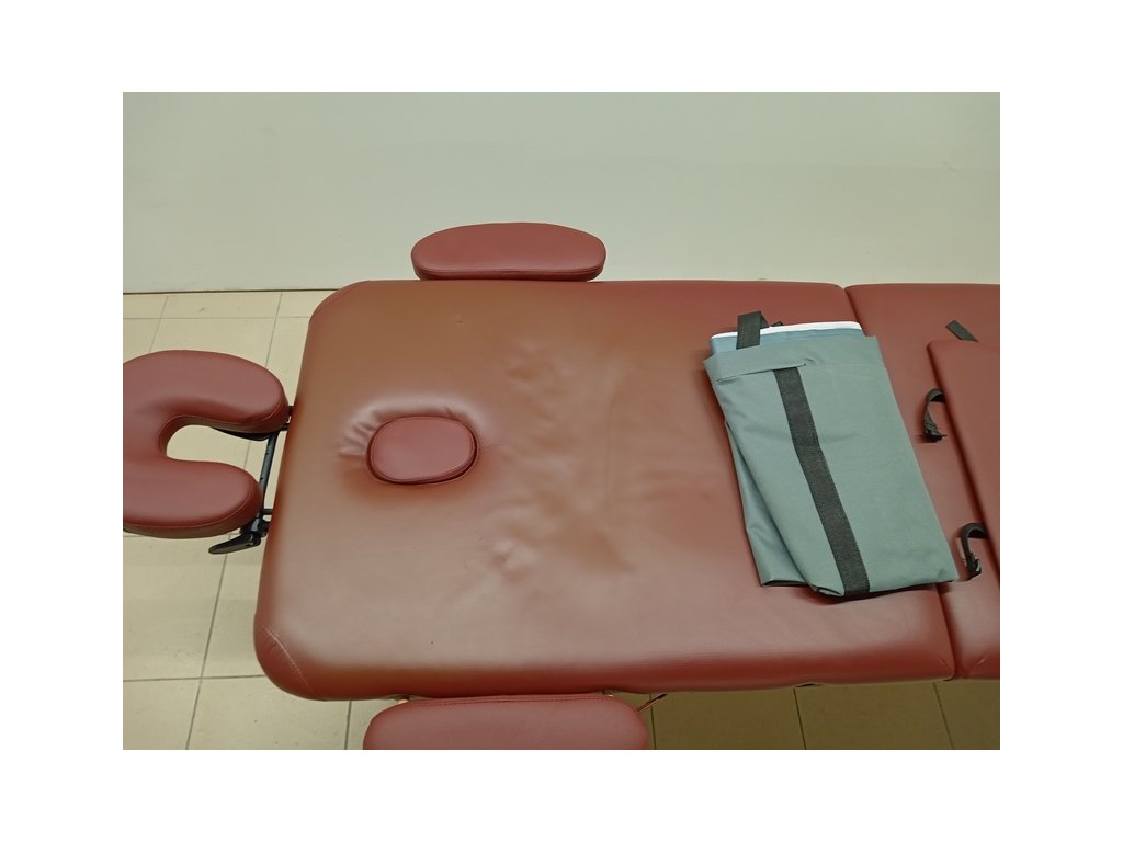 Skladací masážny stôl TANDEM Basic-2 v bordovej farbe bol používaný v masážnej škole. Má vyležaný molitan, mierne vyblednuté a popraskané čalúnenie. Poškodenia vidieť v galérii na priložených detailných fotografiách.